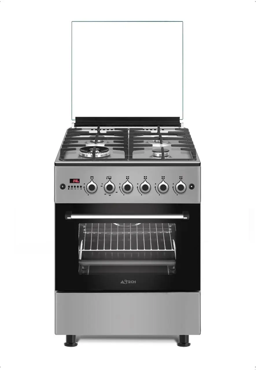 Marque : ASTECH Modèle : CK64 Couleur : Gris Matière : Inox /fer fonte Nombre de feux : 4 feux à gaz 60/60 Chaleur tournante Chauffe plat Tourne broche Minuterie digitale